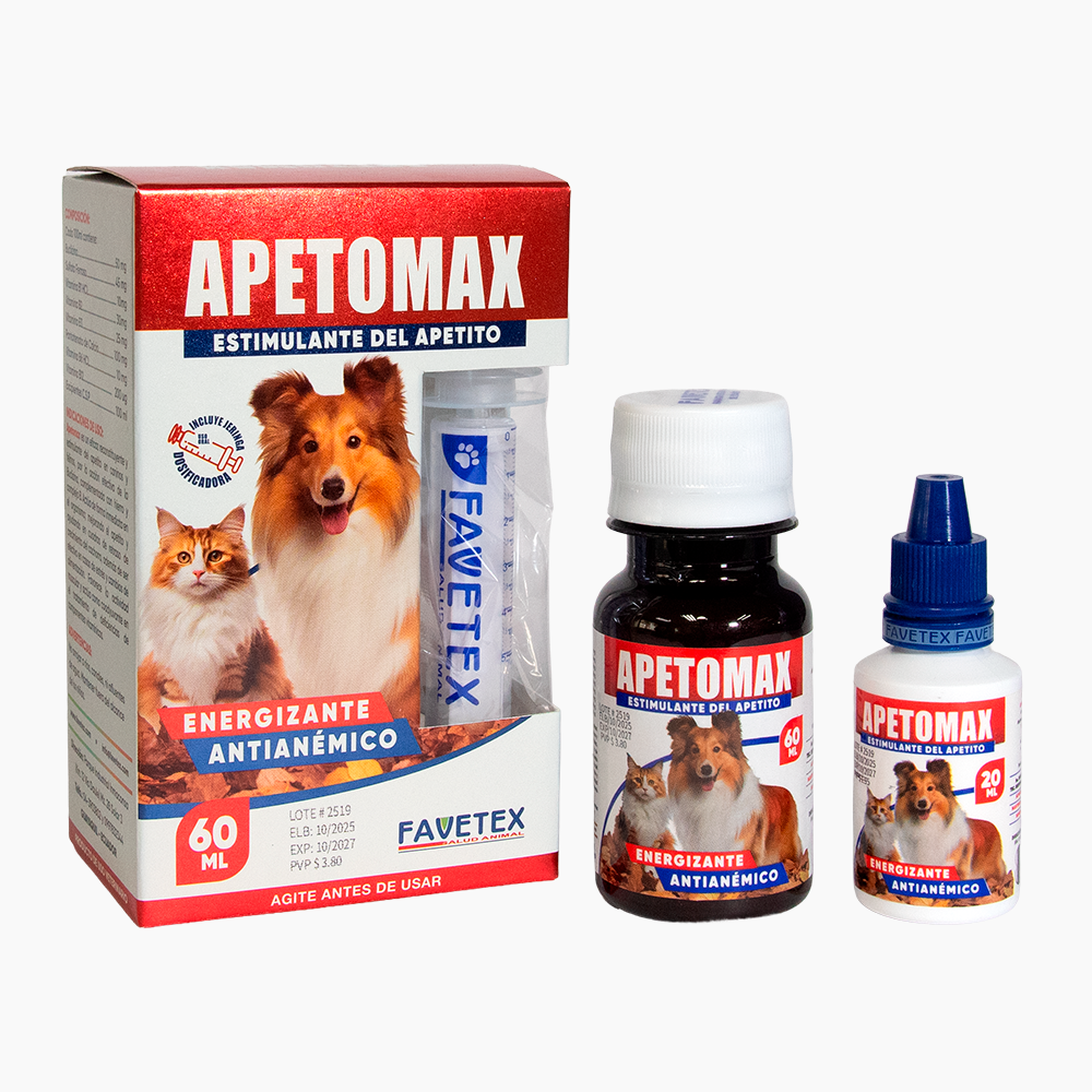 APETOMAX es un eficaz reconstituyente y estimulante del apetito en caninos, felinos, por la acción efectiva de la Buclizina, complementada con hierro y complejo B. Actúa de forma inmediata en el organismo; mejorando el apetito y ayudando en cuadros de retraso de crecimiento del cachorro, además de ser efectivo en casos de estrés y cambios de alimentación.