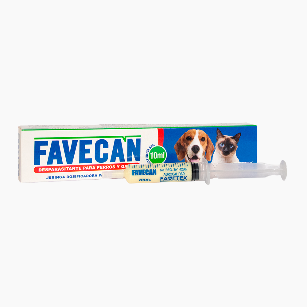 FAVECAN es un antihelmíntico recomendado para caninos y felinos muy eficaz para contrarrestar parásitos intestinales; Nemátodos, Cestodos, tales como: Ancylostomacaninum, Dipylidium canino, Tenia pisiformis, Toxocora canis, Echinococus y Uncinaria.
