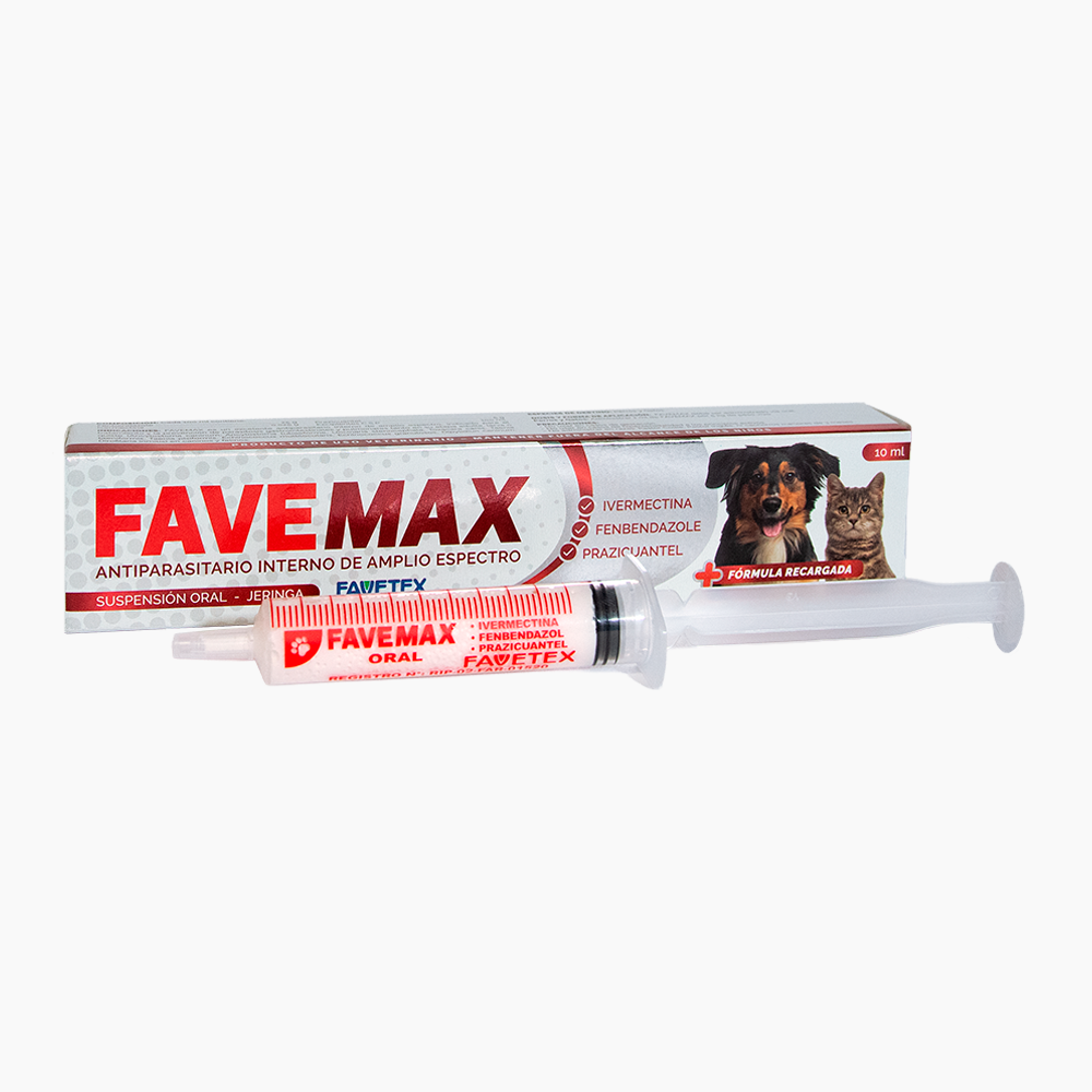 FAVEMAX es un excelente antiparasitario interno de amplio espectro, indicado para el tratamiento y la prevención de parasitosis gastrointestinales y pulmonares tanto en su etapa adulta, larva o quiste (Ancylostoma caninum, Ancylostoma tubaeforme, Uncinaria stenocephala, Toxacara canis, Taenia taeniformis, Taenia pisiformis, Echinococcus multilocularis, Echinococcus granulosos, Dipylidiun caninum, Dirofilaria inmitis) en caninos y felinos.